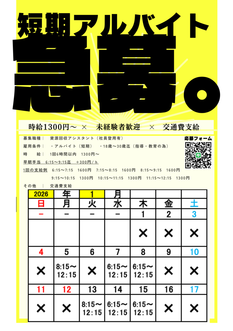 資源回収アシスタントを募集しています。未経験でも可能ですので年末年始に時間に空きがあるかたは是非ご一報ください。
